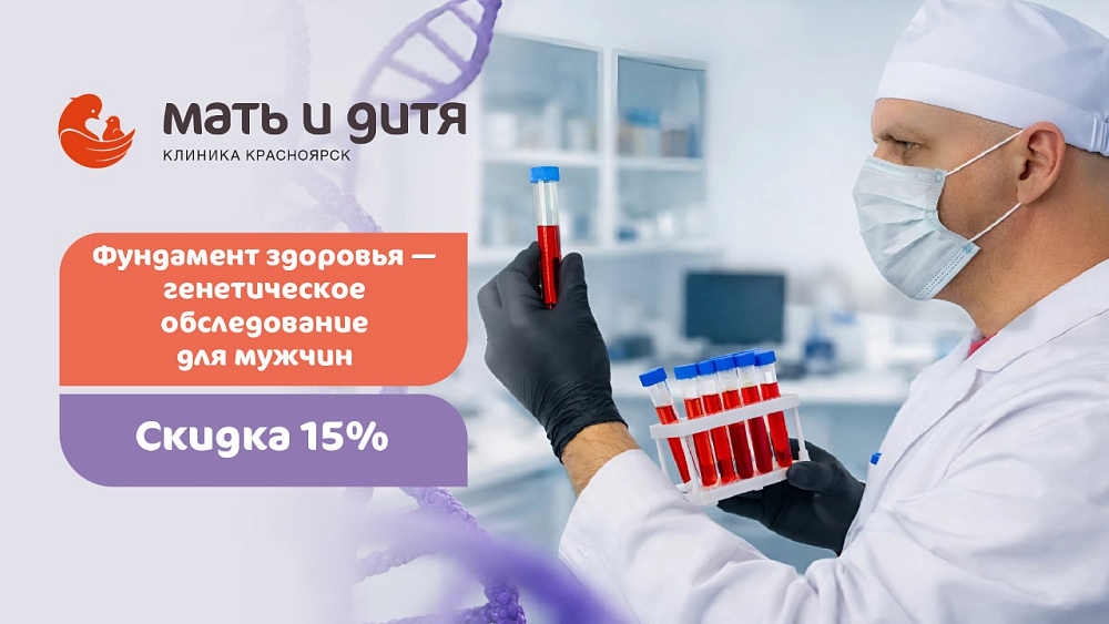 Приглашаем вас пройти комплексное генетическое обследование, которое дает представление о четырех ключевых аспектах мужского здоровья. Специальное предложение действует в клиниках Красноярска на Взлетной и Коломенской
